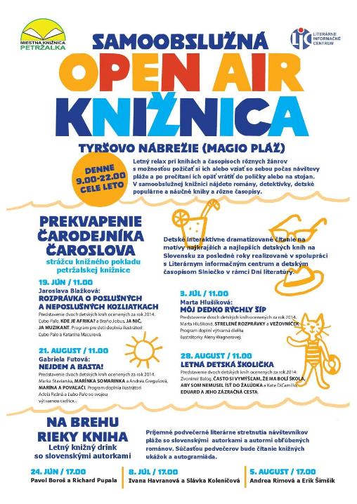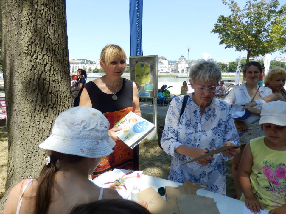Knihy Marty Hlušíkovej dostávajú aj svoju inú podobu, žijú si v Petržalke svoj živý príbeh. Tvorba pre deti slovenskej autorky Marty Hlušikovej je vysoko hodnotená medzi odborníkmi a obľúbená medzi detskými čitateľmi. Preto sme knihu Môj dedko Rýchly šíp, ktorá je typickým prázdninovým príbehom pre deti vybrali a predstavili aj ako divadelné predstavenie pre našich „malkáčikov“ na Magio pláži. Knihy pani Hlušikovej Vežovníček a Strelené rozprávky patria medzi kvalitu v slovenskej detskej literatúry či už po obsahovej alebo ilustračnej stránke a preto pani ilustrátorka Alena Wagnerová pre deti pripravila zaujímavé podujatie, kedy si mohli vyrobiť svojich vlastných škriatkov. Celkovo sme v našej samoobslužnej knižnici na Tyršovom nábreží v toto krásne predpoludnie mohli privítať a knihy predstaviť viac ako sedemdesiatim deťom, ich rodičom a aj návštevníkom pláže.