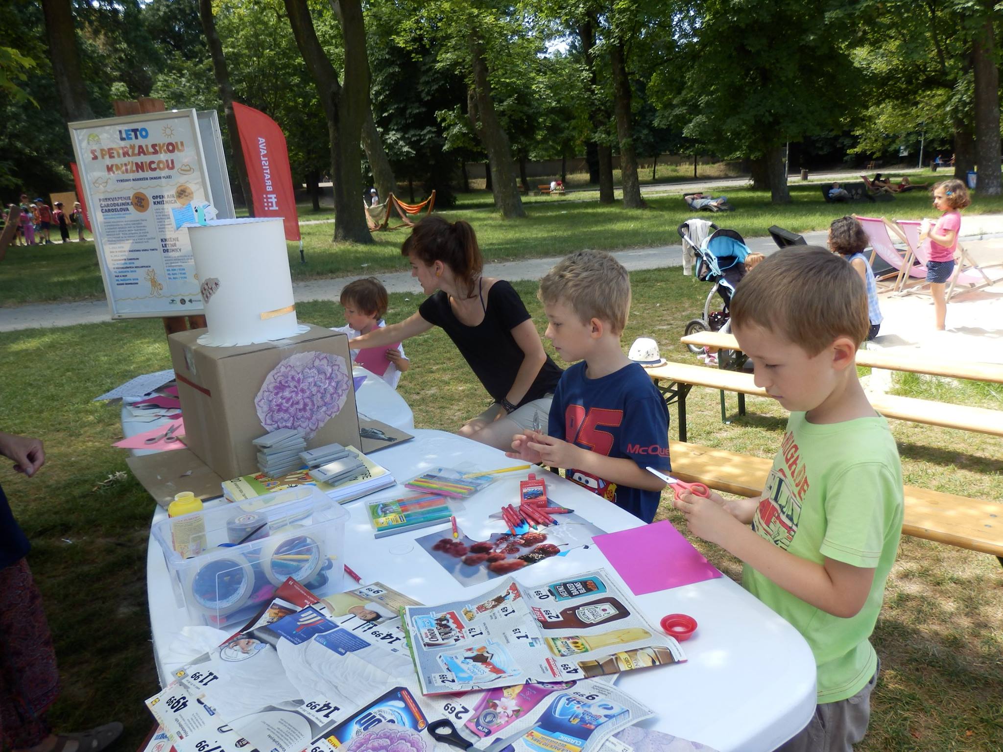 Prvý prázdninový deň sme na letnej pláži na Tyršovom nábreží prežili s o psíčkom a mačičkou, ktorí si uvarili tortu. Pomáhali im deti, ktoré presne podľa rozprávkovej predlohy Josefa Čapka vyberali ingrediencie z rozprávkovej špajze a varili, pomáhali a radili. Po dramatizácii rozprávky si deti mohli s pani výtvarníčkou Alenou Wagnerovou ozdobiť vlastnú veľkú spoločnú rozprávkovú tortu. Podujatie pre deti s radosťou urobili naše knihovníčky Vierka a Zsuzska a realizovali sme ho s podporou detského časopisu Slniečko, ktoré prišla na pláž predstaviť Ľubica Kepštová.