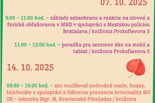 2. 14. 10. 2025 – 09:00 – 10:00 hod. – prednášky sú spojené aj s prezentáciou a diskusiou, s možnosťou aj individuálneho rozhovoru o prevencii seniorov pred telefonickými a internetovými podvodmi s Mgr. Marinou Kravianskou Piksijades z odboru prevencie kriminality Ministerstva vnútra SR.