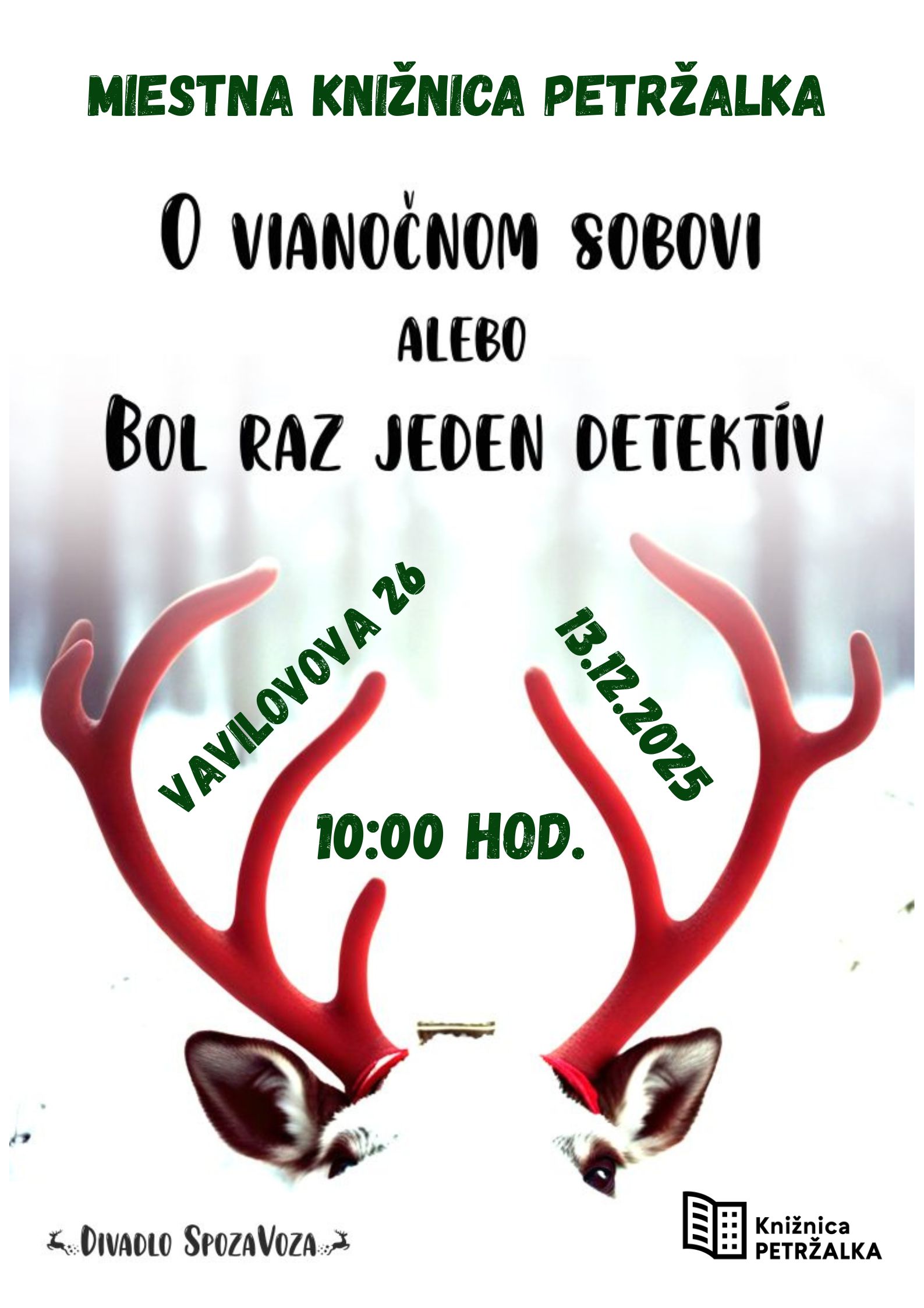 Pobočka Vavilovova 26 Pre deti Rodiny s deťmi vavilovova26@kniznicapetrzalka.sk | +421 947 487 716Zábavná detektívna inscenácia pre všetkých ľudí od 3 rokov o detektívovi Žabó Otovi, ktorý rieši exkluzívny prípad – stratu malého sobíka. Ten sa jedného dňa vytrhol zo sobieho záprahu. Sobie stádo je bezradné. Podarí sa nezvyčajnému detektívovi vyriešiť túto záhadnú situáciu?